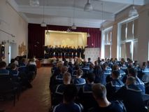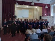 Задорно и лихо сводный хор групп 323 и 352 спели песню «Казаки, казаки, едут, едут по Берлину…..». Несмотря на большое количество участников, исполнили ребята произведение очень четко, передав настроение и позитив этой прекрасной песни. Спасибо им за это!