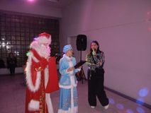 На дискотеку пришли Почетные гости – это Дед Мороз и Снегурочка. Которые организовали для участников мероприятия конкурсы и игры.