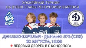 С 28 по 30 августа в Кондопоге состоится турнир на Кубок Главы Карелии по хоккею. В Ледовом дворце города встретятся три команды: «Динамо-Карелия» (Кондопога), «Арктика» (Мурманск) и «Динамо 576» (Санкт-Петербург).